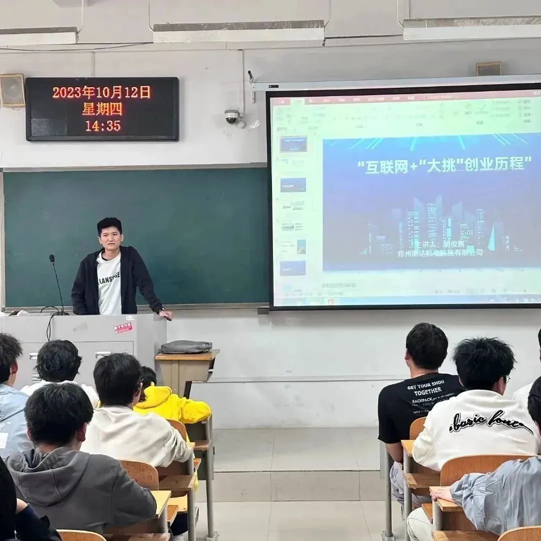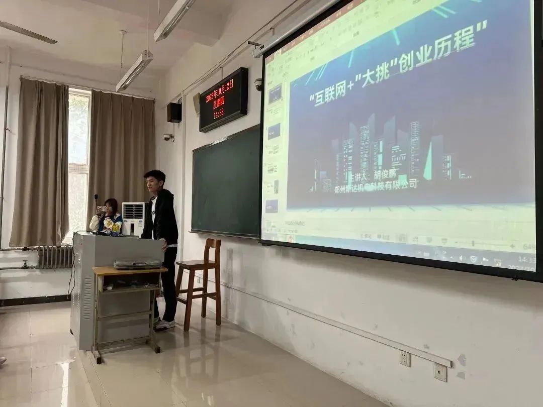胡俊鹏还分享了立足所学专业,创办科创型企业的心路历程和发展经验,介绍了学校对大学生创新创业的扶持政策,”炫耀”了自己读书和创业期间所收到的来自学校各方面的支持和帮助,鼓励同学们把握好大学时光,为自己人生路上的创新创业打下坚实基础。