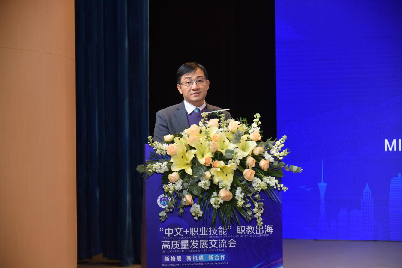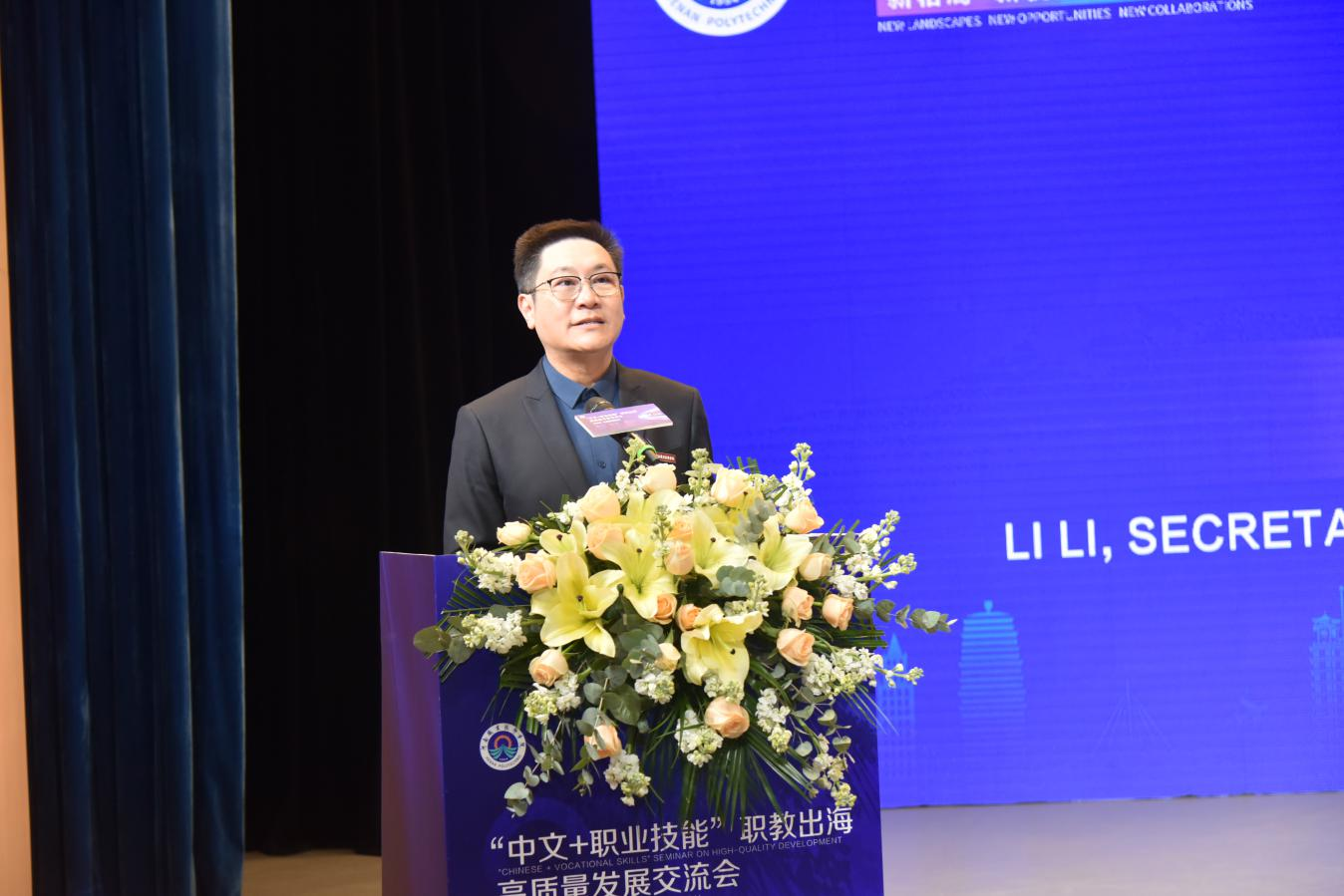 校党委书记厉励在致辞中对与会嘉宾领导和各界朋友来校表示热烈的欢迎和诚挚的感谢,并简要介绍了学校办学历程、办学特色和办学成绩,重点分享了学校在国际合作交流和“中文+职业技能”职教出海中取得的显著成效。他期待,能够携手海内外职业院校,扎根中国、融通世界,立足时代、面向未来,不断加大与“一带一路”沿线国家的合作与交流,建立健全职业教育国际化人才培养体制机制,打造具有全球胜任力的人才培养体系,为构建人类命运共同体贡献职业教育力量。