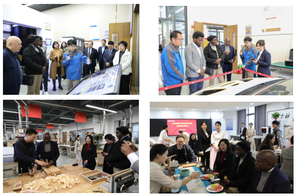 赞比亚职业教育使团一行还在夏新颜校长和赵丽霞处长的陪同下,参观了学校的智能制造学院、汽车工程学院等实训中心。他们详细了解了学校的教学设施、实训条件和师资力量,对学校的教学质量和办学水平给予了高度评价。