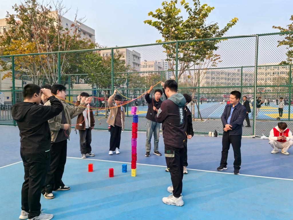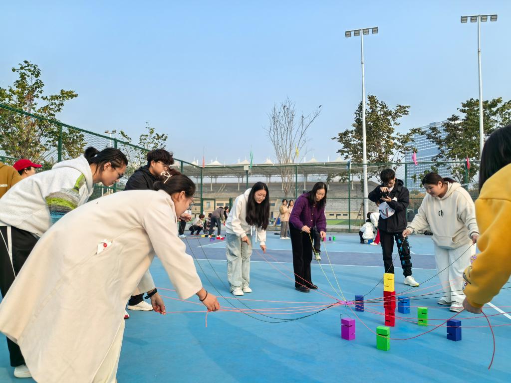 破冰暖身环节之后,同学们组建了团队,消除了彼此间的隔阂与羞涩,在专业教练的指导下,各团队按照随机抽签的顺序,依次体验了移花接木、鼓动人生、合力筑塔、沙场点兵、千里传珠等五个活动。“移花接木”活动考验了同学们的反应能力和团队的整体协调性;“合理筑塔”活动让同学们找到了宁心聚神和团队合作的默契;“沙场点兵”活动,考验了队友们的语言表达和方位感知的能力。“鼓动人生”让大家体会到团队合作的重要性,培养大家的团队意识。“千里传珠”不仅让同学们体验到团队合作的乐趣,还能领悟到了在集体中不要因为队友的失误而责怪,而应该鼓励和支持的重要性。每一项比赛都需要团队密切协作才能完成。一个个妙趣横生的游戏不断将气氛推向高潮,整个活动场地充满了笑声和欢呼声。老师们也积极加入,和同学们一起迎难而上,大胆挑战。