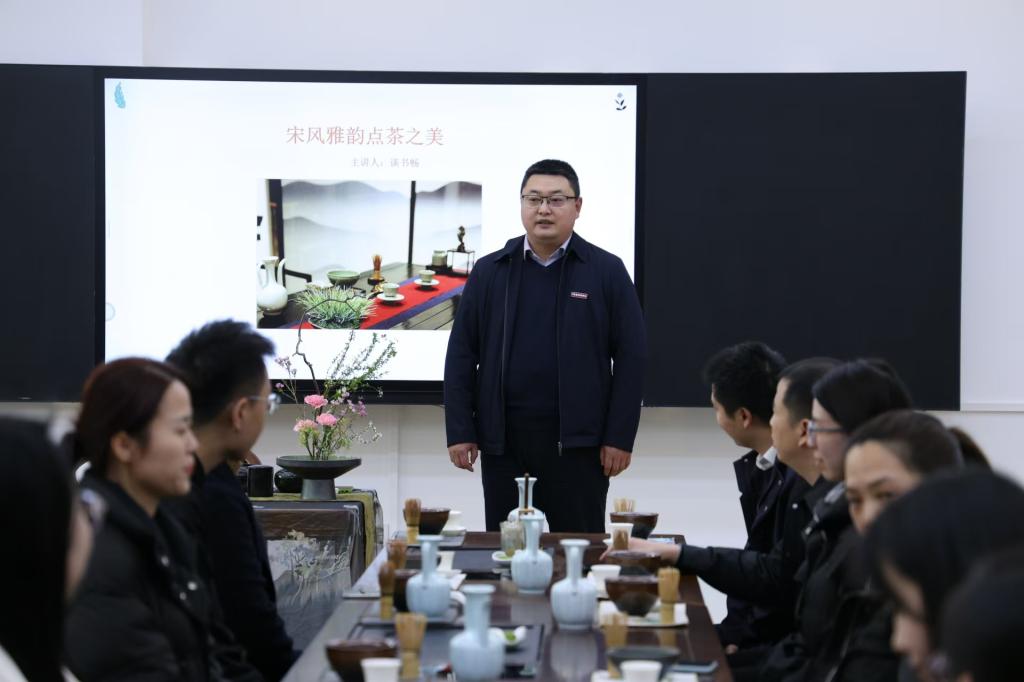 随后,大家欣赏了精彩的宋代点茶茶艺展示。茶艺师身着宋代服饰,手法娴熟地进行着点茶表演,从碾茶、罗茶、候汤、烫盏到调膏、击拂,每一个步骤都透露出宋代茶文化的精致与讲究。紧接着,一场关于“宋风雅韵点茶之美”的讲座为大家揭开了点茶艺术的神秘面纱。讲座详细为大家介绍了点茶的历史渊源、点茶茶器和流程。通过生动的讲解和丰富的图片展示,大家对点茶艺术有了更加全面和深入的了解。
