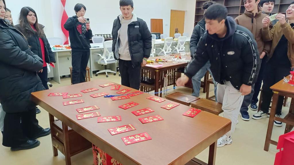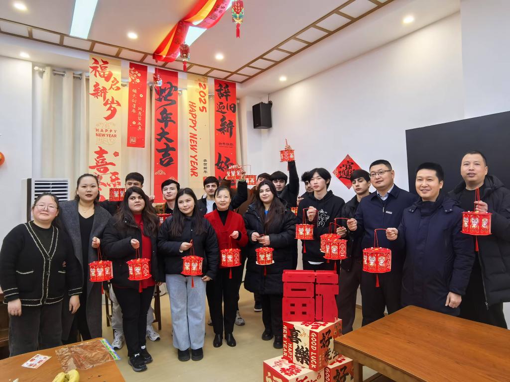 活动现场大红灯笼高高挂起,福字贴纸点缀其间,处处洋溢着浓浓的年味儿。在手工制作灯笼环节,大家一起精心细致地折叠纸张、粘贴骨架,一个个造型各异、色彩斑斓的灯笼逐渐成形。看着自己亲手制作的灯笼,同学们的脸上洋溢着成就感和喜悦。老师们一边指导留学生制作,一边讲解灯笼在中华文化中象征着团圆与和谐、光明与希望的寓意,并鼓励大家继续努力学习中文、了解中国文化,成为中外文化交流的友好使者。随后进行的粘红包环节将活动推向了高潮。装有新年贺词和纪念品的红包铺放在桌子上,同学们击鼓传花,传到的同学就站在远处甩出硅胶小手掌粘取一个红包。每当有人抽中大奖时,现场都会爆发出一阵阵热烈的掌声和欢呼声。红包不仅承载着学院的祝福和心意,也让留学生们感受到了浓浓的节日氛围。他们纷纷用优美的舞姿和动听的歌声表达了对中国文化的热爱和赞美。午餐时刻,师生一起煮饺子、吃饺子,留学生们开心地表示这是他们吃过的最美味的饺子,让他们感受到了家一样的温暖。