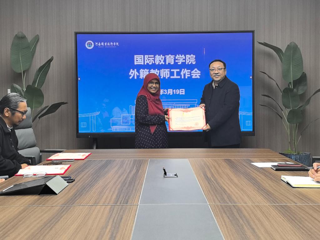 鲁冬首先对全体外教表示感谢,对本学期马来西亚国民大学外教团队表示欢迎。他指出,外教为我校国际化办学能力和人才培养质量的提升做出了巨大贡献,是我校不可或缺的国际化力量,希望外教能够充分发挥自己的专长和优势,与学校的教学团队紧密合作,共同探索符合我校实际的中外合作办学模式。随后,鲁冬向马来西亚国民大学教师颁发聘书。