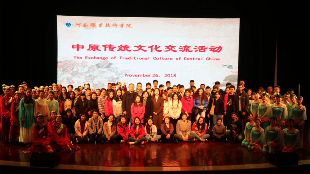 11月26日下午,来自郑州大学的8个国家的49位留学生以及留学生部教师共计55人,与学校中外合作办学学生进行了中原传统文化的交流活动。本次活动在音乐厅举行了开幕式,学校副校长王皓出席并致辞。音乐学院、烹饪食品与健康学院、团委和合作交流处共同协作,积极酬备了此次交流活动。