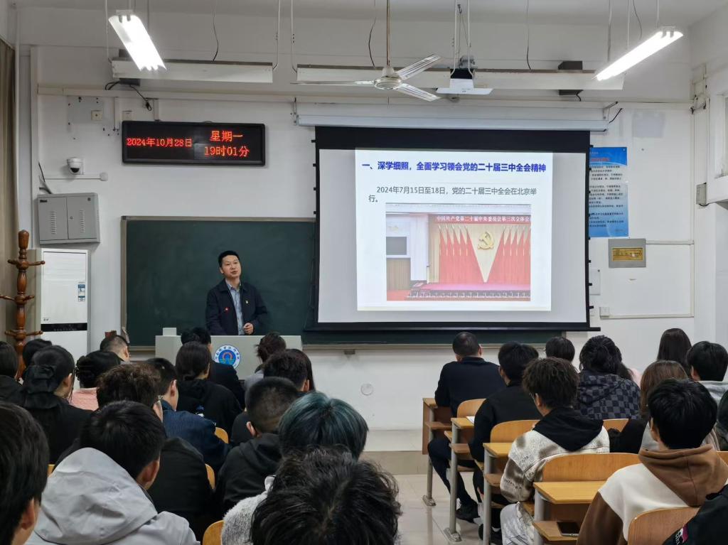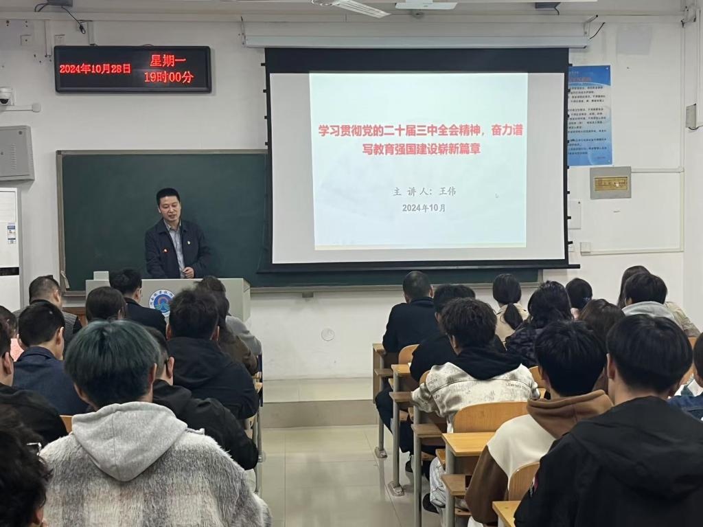 为深入贯彻党的二十届三中全会精神,提升学院师生的政治素养和理论水平,根据校党委统一部署,10月28日晚,党的创新理论“笃行”宣讲团成员、太阳成集团tyc9728党总支书记王伟在2202教室为学院师生宣讲党的二十届三中全会精神。太阳成集团tyc9728全体教师和近70名学生入党积极分子参会。