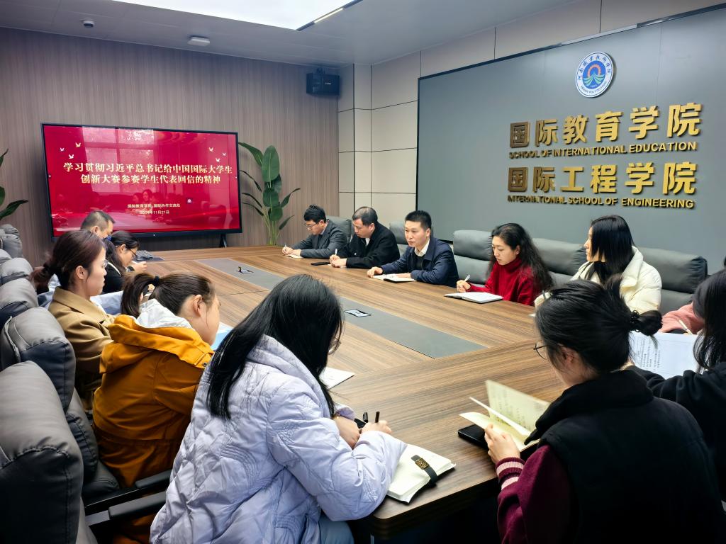 会上,黄晶晶带领大家学习了习近平总书记给中国国际大学生创新大赛参赛学生代表的重要回信内容,并分享了心得体会。我院党总支书记王伟做总结发言,他指出,习近平总书记的回信充分彰显了以科技创新和大师引领来驱动人才自主培养能力全面提升,建立科技创新与人才培养相互促进的有效机制。落实到我院实际来看,2022级中外合作办学专业学生团队在2024年中国国际大学生创新大赛中与来自全国的优秀青年学生同场竞技,斩获全国银奖,成绩来之不易。我院师生要以此为契机,积极谋划开展双创工作,争取未来在国赛中继续取得优异成绩。