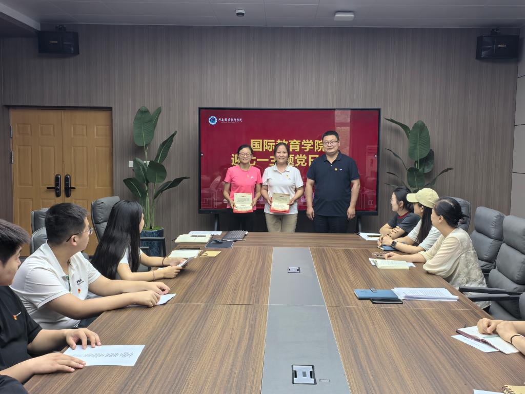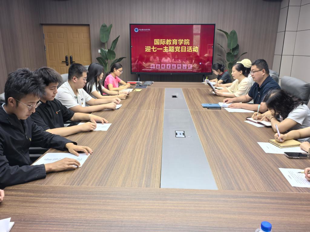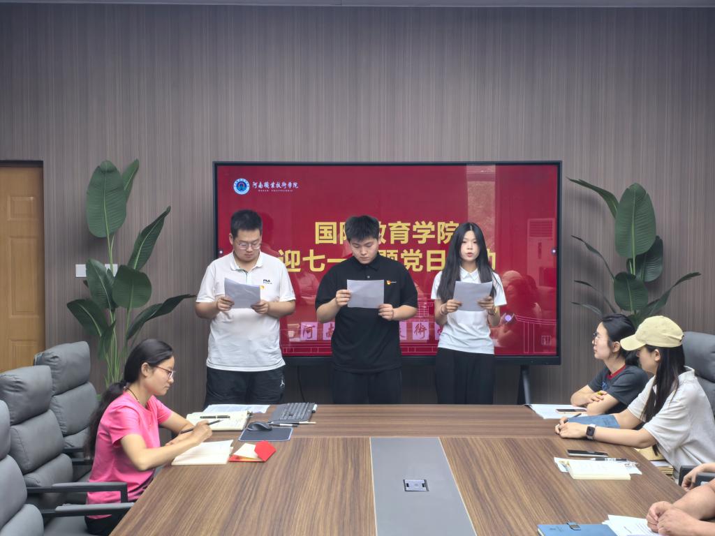 在活动中,党支部副书记郭丽和组织员樊林分别领学了习近平总书记讲话金句和评论员文章《激活高校学生社区党建“神经末梢”》。随后,党支部书记解鹏程为党员代表送上“政治生日”贺卡,樊林结合自身从教经历,畅谈对党员责任的理解;学生党员代表朗诵了诗歌《红色的七月》,通过“燎原的星火”“不灭的灯”等意象,生动诠释中国共产党百年奋斗的世界意义;通过“被你点亮的心灯,要用燃烧的生命照亮”等坚定信念,传递出新时代青年的使命担当。朗诵声情并茂,现场反响热烈。活动最后,全体党员纷纷表示将立足岗位,在促进中外文化交流中展现党员担当。