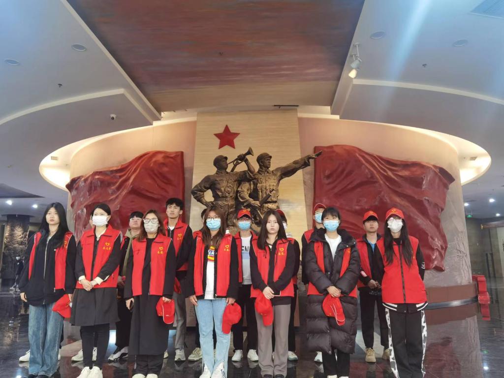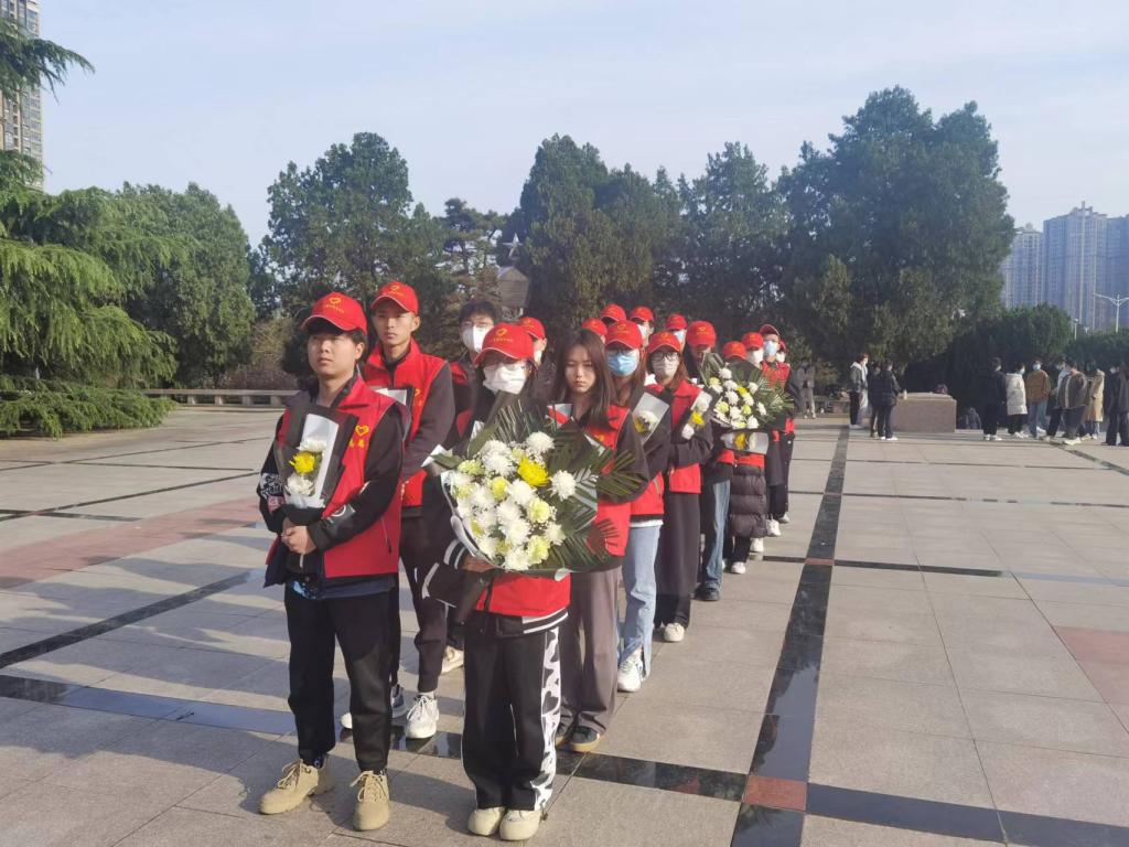 在巍峨的烈士纪念碑下,全体师生向革命烈士敬献了鲜花并为烈士默哀。国教院团支部副书记赵冠营做了《继承革命精神,学习践行二十大》的演讲,带领全体同学重温入团誓词。苍松翠柏郁郁葱葱,青春少年誓言铮铮。